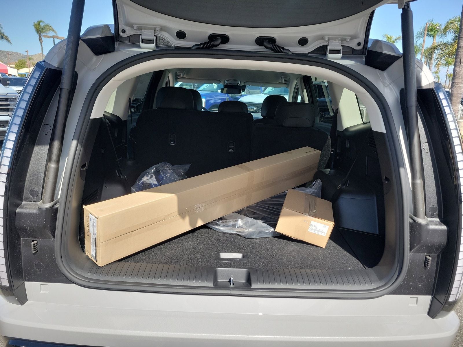 Option Group 01, Tow and Go Package (Ball Mount Kit and Tow Hitch), 20 x 8J Alloy Wheels, 3rd row seats: bench, 4-Wheel Disc Brakes, 8 Speakers, ABS brakes, Air Conditioning, Alloy wheels, AM/FM radio: SiriusXM, Apple CarPlay & Android Auto, Auto High-beam Headlights, Auto-dimming Rear-View mirror, Auto-leveling suspension, Automatic temperature control, Bodyside moldings, Brake assist, Bumpers: body-color, Cargo Cover, Cargo Net, Carpeted Floor Mats, Delay-off headlights, Driver door bin, Driver vanity mirror, Dual front impact airbags, Dual front side impact airbags, Electronic Stability Control, Emergency communication system: None, First Aid Kit, Four wheel independent suspension, Front anti-roll bar, Front Bucket Seats, Front Center Armrest, Front dual zone A/C, Front reading lights, Fully automatic headlights, Garage door transmitter: HomeLink, H-Tex Leatherette Seating Surfaces, harman/kardon® Speakers, Heated and Ventilated Front Bucket Seats, Heated door mirrors, Heated front seats, Heated rear seats, Heated steering wheel, Illuminated entry, Leather steering wheel, Low tire pressure warning, Navigation System, Occupant sensing airbag, Outside temperature display, Overhead airbag, Overhead console, Panic alarm, Passenger door bin, Passenger vanity mirror, Power door mirrors, Power driver seat, Power Liftgate, Power passenger seat, Power steering, Power windows, Radio: AM/FM/SiriusXM/HD Audio System, Rain sensing wipers, Rear air conditioning, Rear anti-roll bar, Rear Bumper Applique, Rear reading lights, Rear seat center armrest, Rear side impact airbag, Rear window defroster, Rear window wiper, Reclining 3rd row seat, Remote keyless entry, Security system, Severe Weather Kit, Speed control, Split folding rear seat, Spoiler, Steering wheel mounted audio controls, Telescoping steering wheel, Tilt steering wheel, Traction control, Trip computer, Turn signal indicator mirrors, Variably intermittent wipers, and Ventilated front seats.