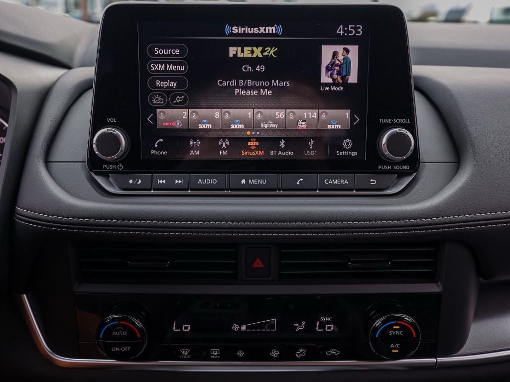 - Radio: AM/FM NissanConnect -inc: 6 speakers plus 2 tweeters, Apple CarPlay, Android Auto, 8" color touch screen display, Bluetooth®, 2 front USB type-C, Wi-Fi hotspot and NissanConnect Services powered by SiriusXM