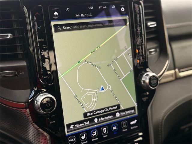 Diamond Black Crystal Pearlcoat luxury meets legendary HEMI V8 power in this premium 4WD truck, delivering impressive performance with a 5.7L engine, eTorque system, and smooth 8-speed automatic for confident towing and hauling. Bold styling is elevated by 20 inch polished wheels, chrome accents, and a dual-pane panoramic sunroof, while auto-leveling suspension enhances ride quality and capability. Inside, a first-class cabin features premium leather seating with heated and ventilated front and rear seats, genuine wood trim, a massive 12 inch touchscreen with navigation, and advanced tech throughout. Safety and driver assistance are top-tier with adaptive cruise control, lane keep assist, park assist, a rearview camera, and forward collision warning for complete confidence on every drive.